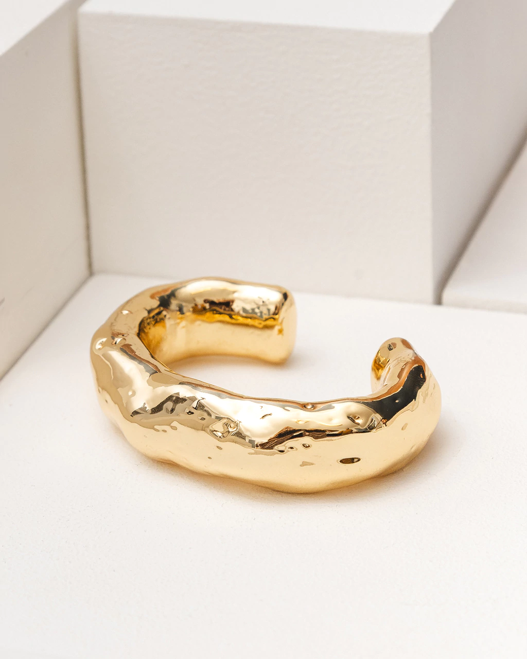 Bracelete em metal com banho de ouro 18k de 2 milésimos, camada hipoalergênica e verniz especial de proteção. É uma peça com formas e relevo orgânicos, produzida em eletroformação - uma tecnologia italiana de fabricação nacional. Este processo resulta em peças de metal notavelmente mais leves e confortáveis, mantendo sua presença marcante.